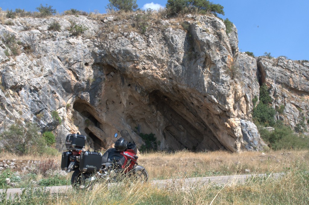 (Πίσω όψη της μοτοσυκλέτας με τις βαλίτσες, δίπλα στον βράχο)