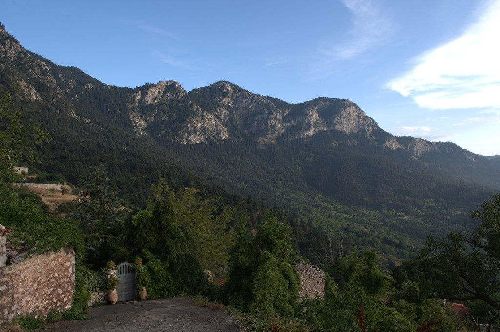 (Το χωριό με φόντο τις απόκρημνες κορυφές του Παρνασσού)