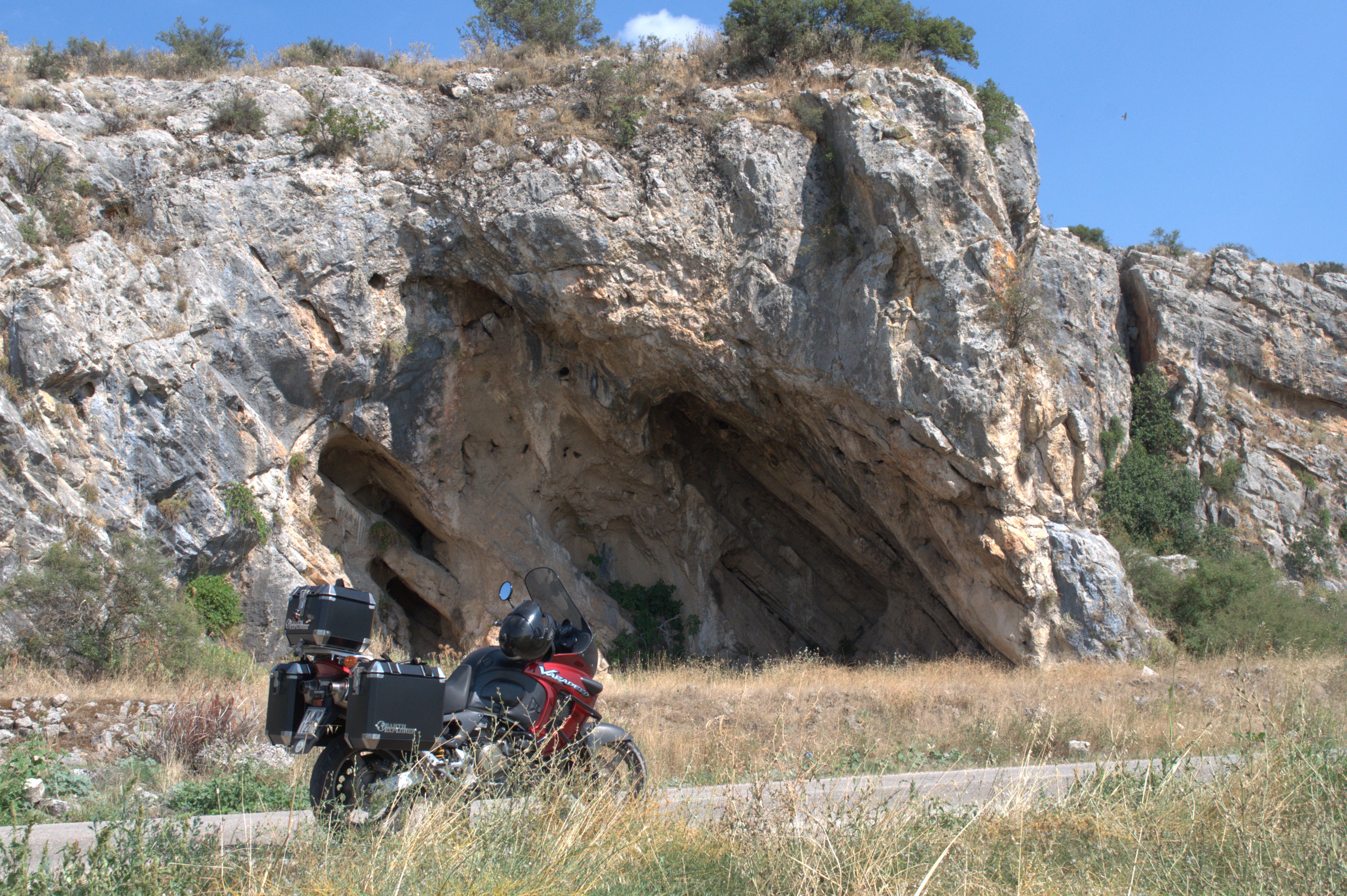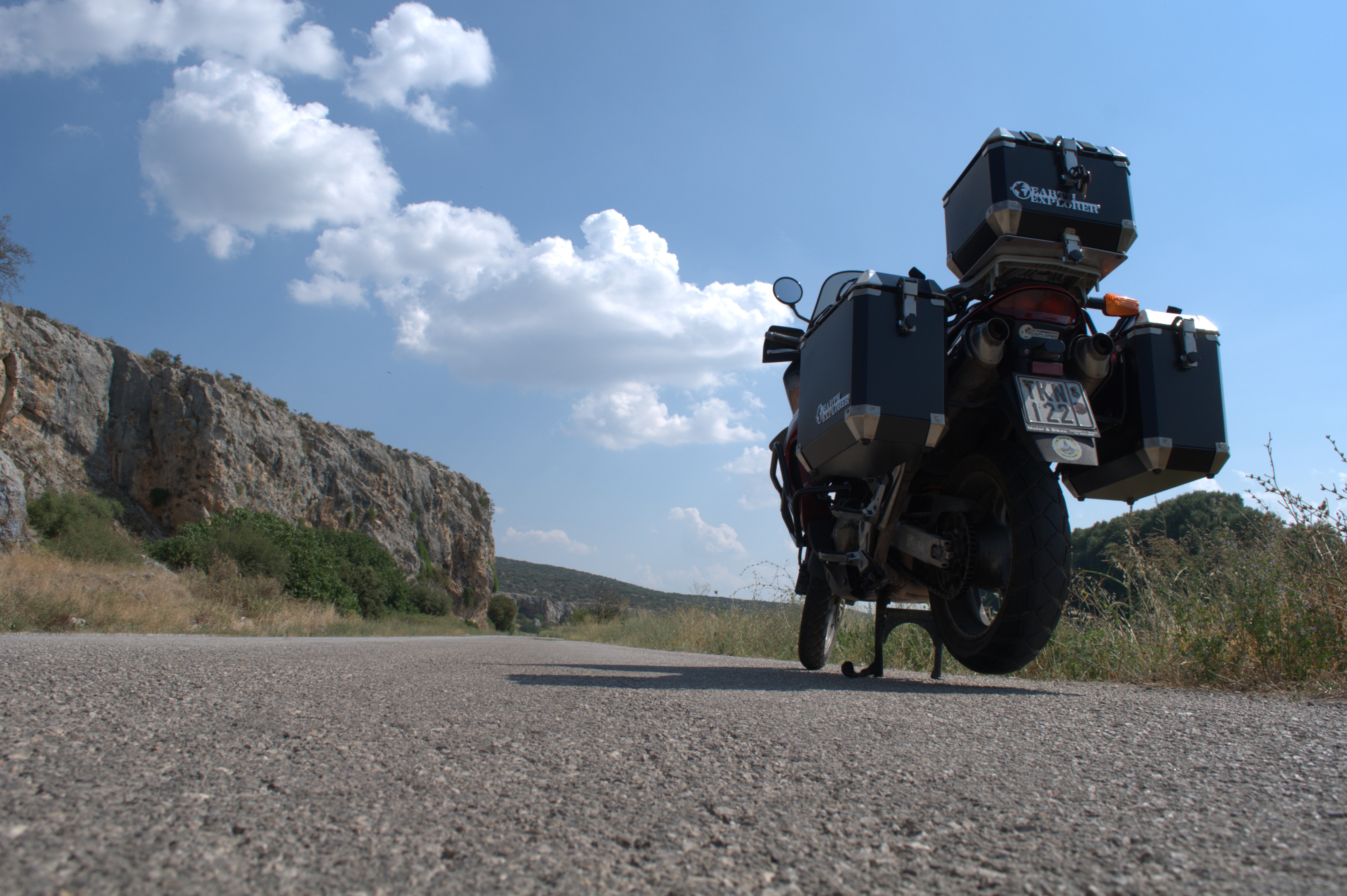 (Πίσω όψη της μοτοσυκλέτας με τις βαλίτσες, δίπλα στον βράχο)