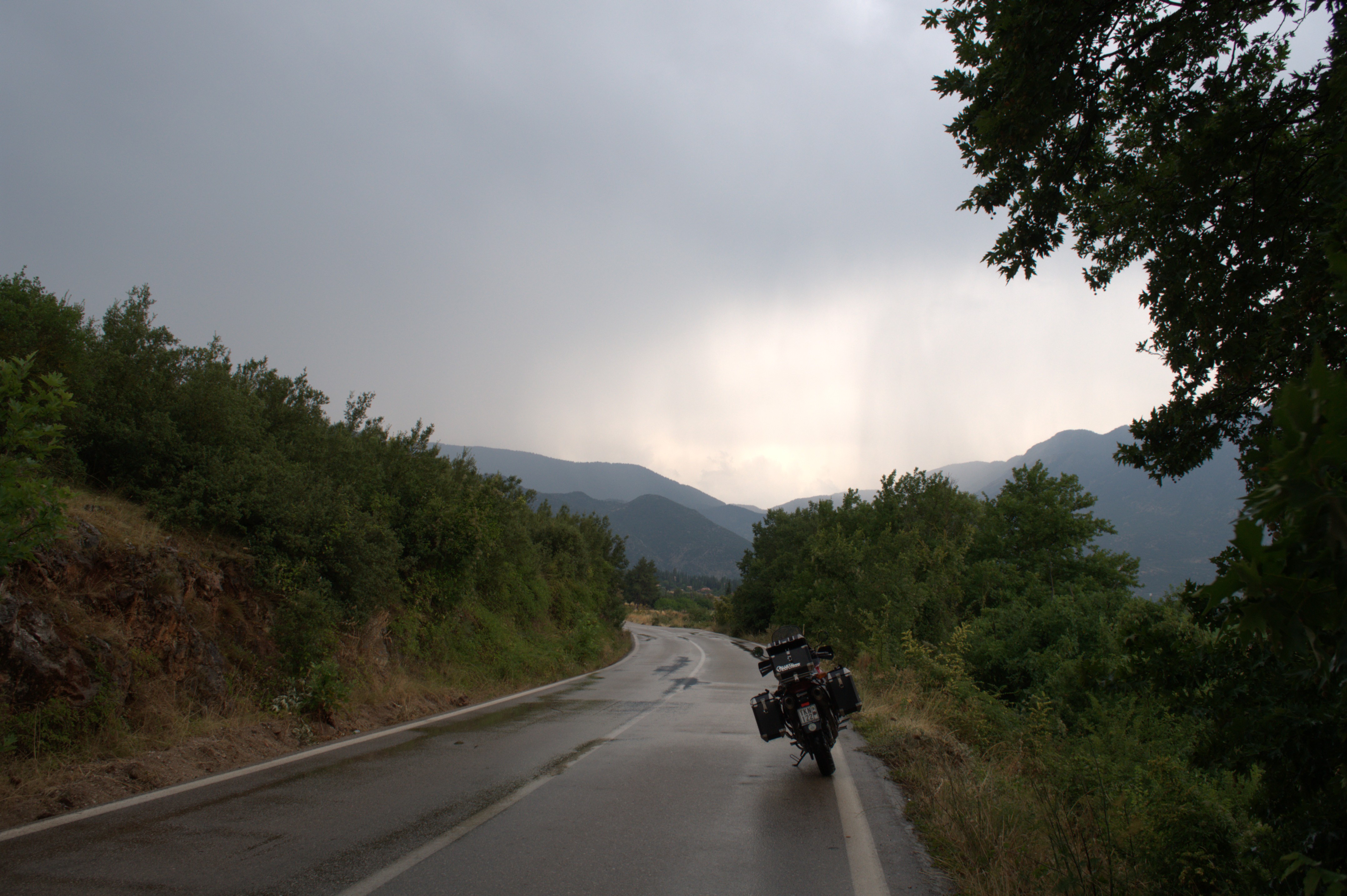 Καθώς ο δρόμος άρχισε να ανηφορίζει προς τους πρόποδες του Παρνασσού, ο καιρός έδειξε τα δόντια του. Ο ουρανός βάρυνε και η βροχή έκανε την άσφαλτο γυαλί.